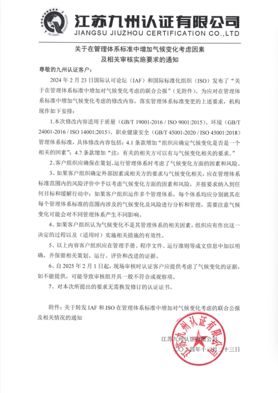 江蘇九州認證有限公司關(guān)于在管理體系標準中增加氣候變化考慮因素及相關(guān)認證實施安排的通知